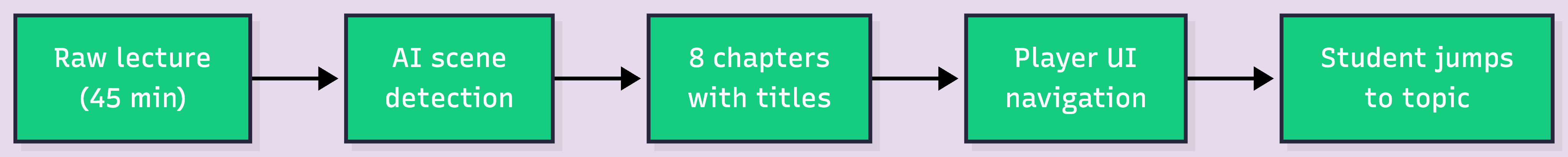 A course platform we worked with had 400+ lectures, each between 30 and 90 minutes long. Their completion rate was sitting around 22%. Students would start a lecture, scrub around trying to find the section they cared about, give up, and leave. The team knew chapters would help. They also knew that asking 60 instructors to manually timestamp their recordings was never going to happen.