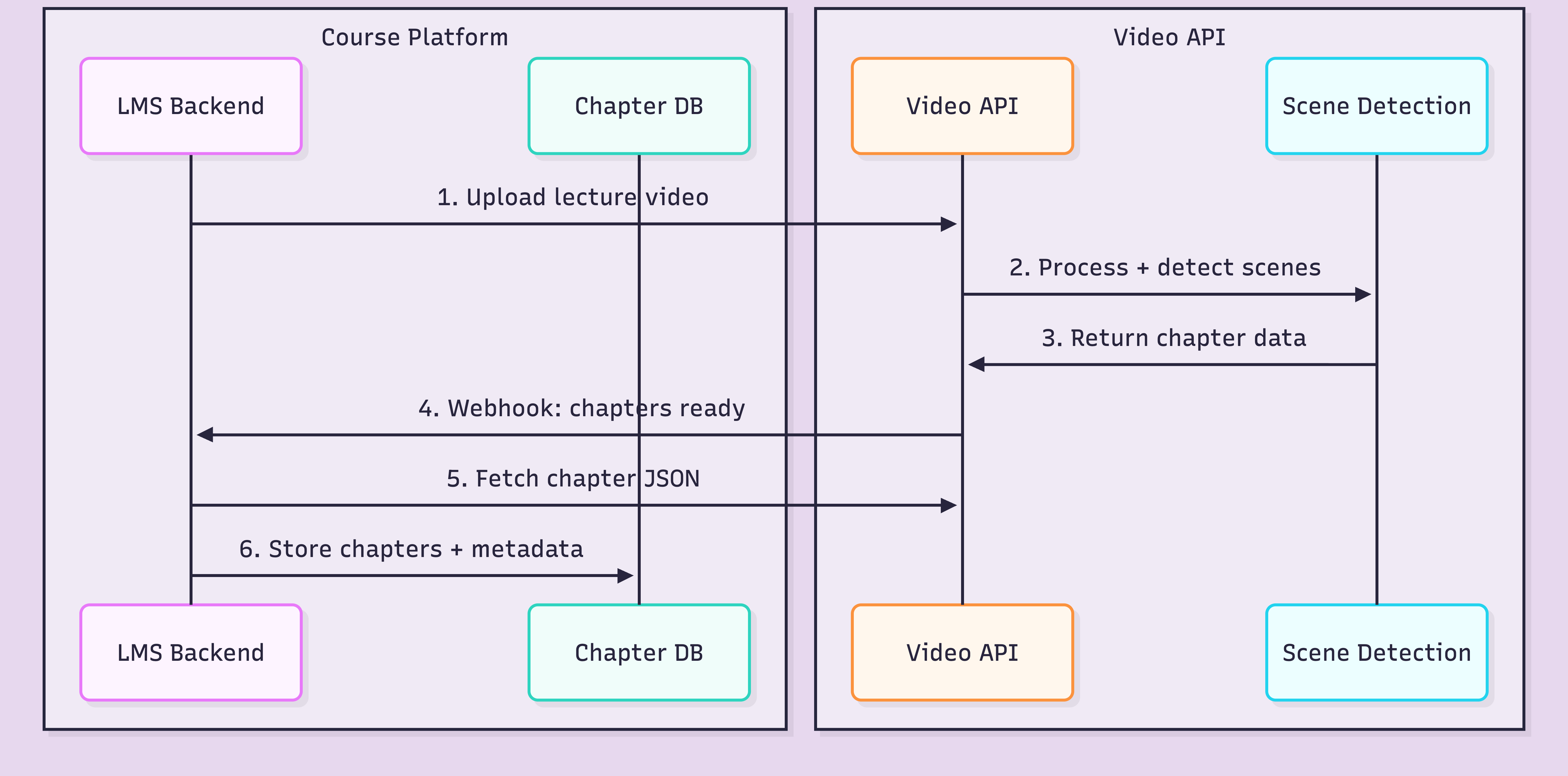 If you are building on FastPix, the SDKs for Node.js, Python, Go, Ruby, PHP, Java, and C# handle the API calls. Your backend fetches chapter data after the webhook fires, maps scene descriptions to your course data model, and stores it. Check our Udemy-style platform tutorial for a full implementation walkthrough.