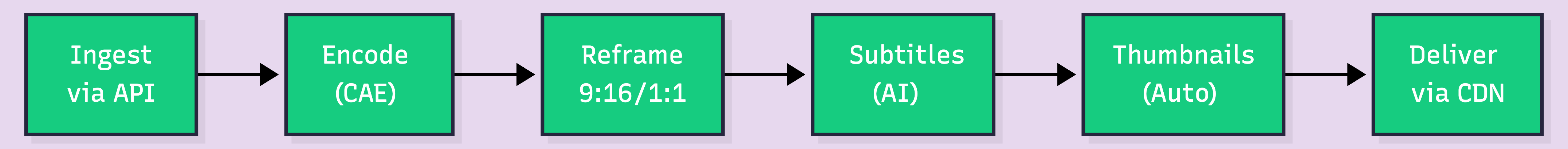 Each node is an API call. Each transition is a webhook. The entire pipeline runs without anyone logging into a dashboard, dragging files, or matching subtitle tracks to video files in a spreadsheet.