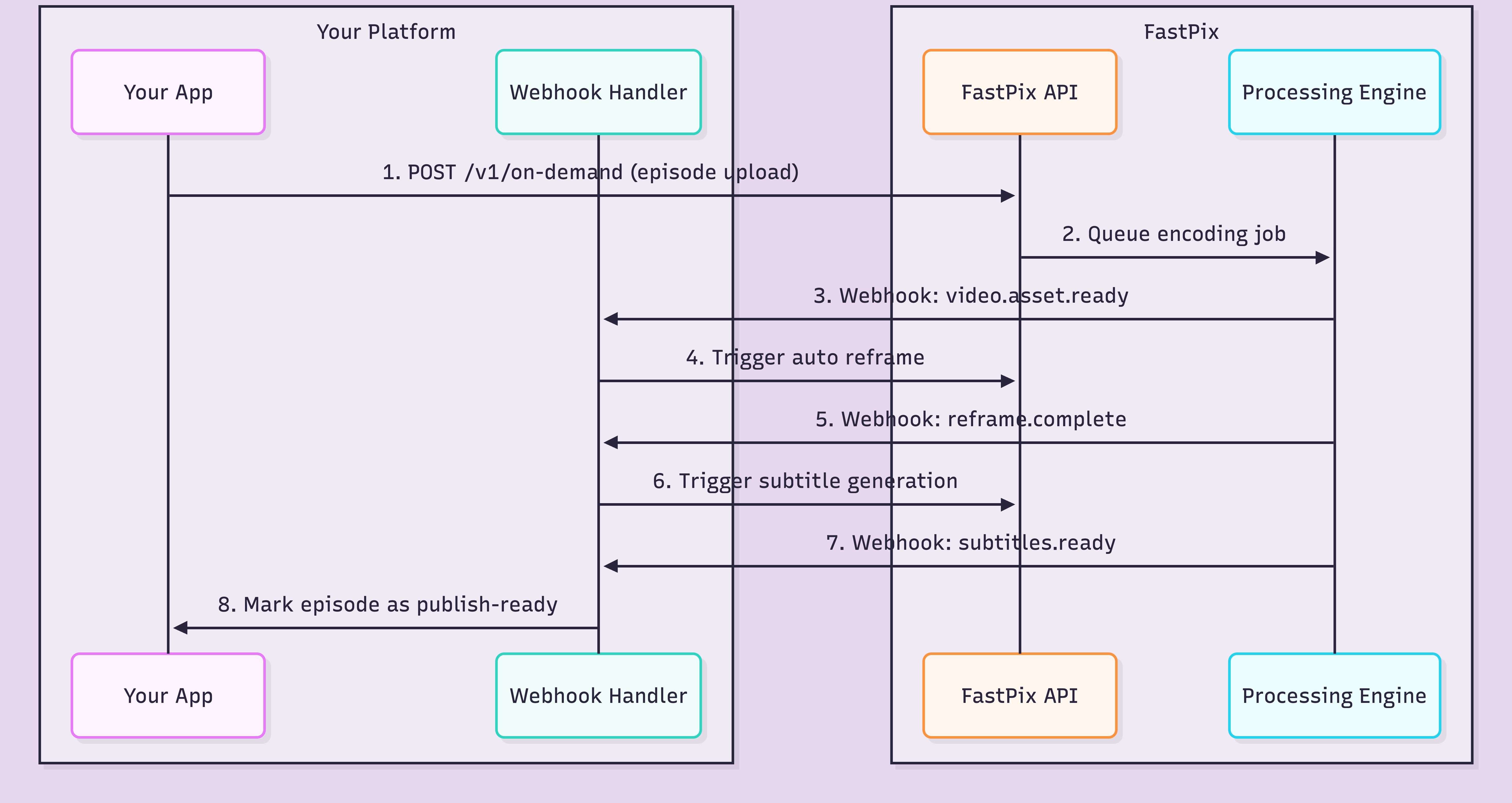 }Your metadata comes back intact. Your webhook handler matches it to the right series, the right season, the right episode. No spreadsheet. No filename matching. No "which version of episode 47 is the right one" Slack messages at 11pm.